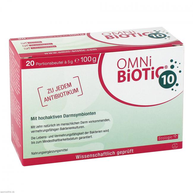 Während der gesamten Antibiotika-Therapie 2 x täglich 1 Beutel OMNi-BiOTiC® 10 (= 5 g) in 1/8 l Wasser einrühren, mindestens 1 Minute Aktivierungszeit abwarten, nochmals umrühren und dann trinken. Nach der Antibiotika-Therapie möglichst noch 14 Tage lang 1 x täglich 1 Beutel einnehmen.