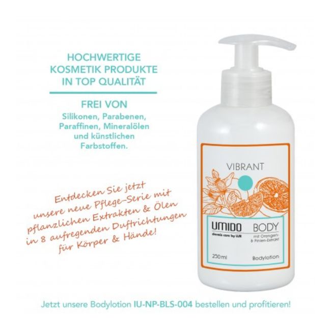 Die exklusive UMIDO Körperpflege zieht schnell ein und versorgt die Haut intensiv mit Feuchtigkeit. Diese wohltuende Body-Lotion verwöhnt Haut und Sinne mit einem angenehmen Duft von Orangen- und Pinien-Extrakt.