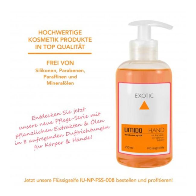 Frei von Silikonen, Parabenen, Paraffinen und Mineralölen. Die UMIDO Flüssigseife EXOTIC enthält Papaya- und Hibiskus-Extrakt und kommt im praktischen Spender. Diese pflegende Handseife ist ideal für Ihre tägliche Pflege und Hygiene.